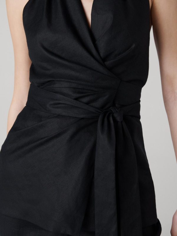 Made from a soft linen, the sleeveless Alyssa Wrap Top has a halterneck and an open back.