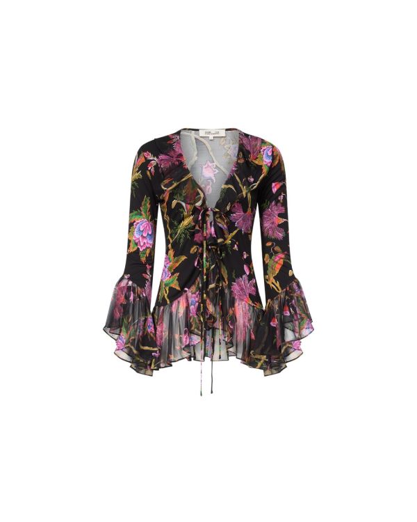 The Charlise Blouse features a refined floral print and soft ruffles, seamlessly transitioning from work to evening.