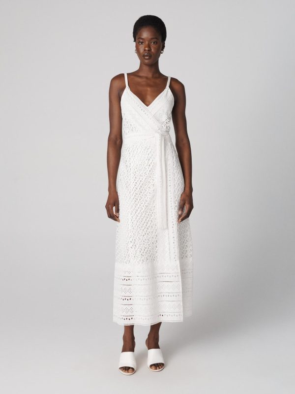 The Evangelia midi wrap dress features exquisite Cane Link lace texture that creates an elegant resort-ready look.