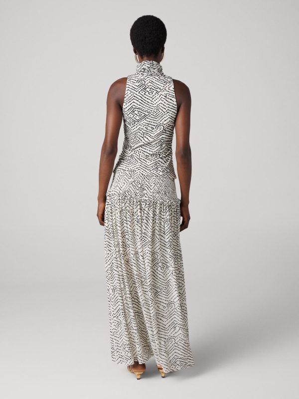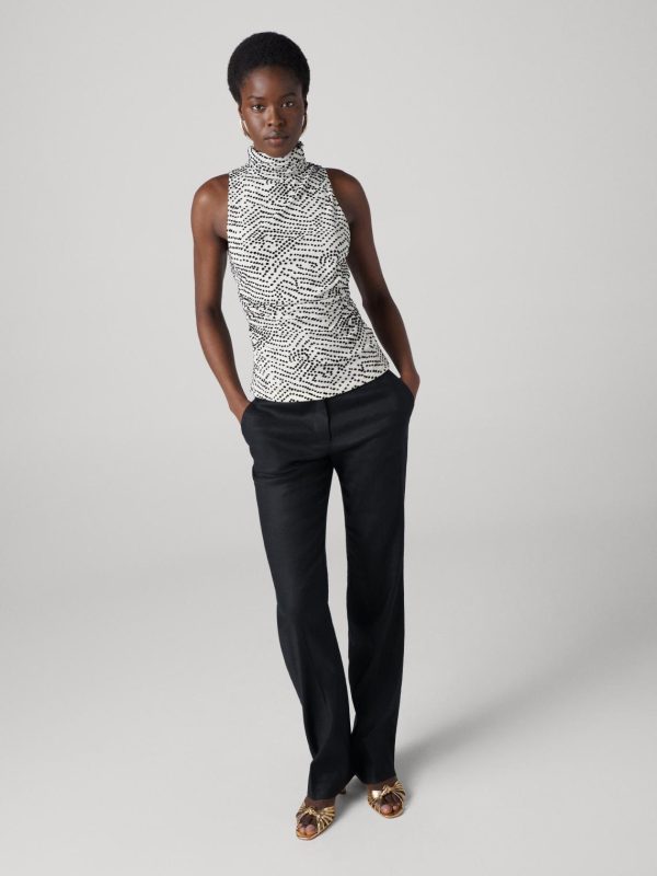 Cut from a flocked mesh, the sleeveless Frances Top is a turtle neck silhouette with soft ruching and texture.