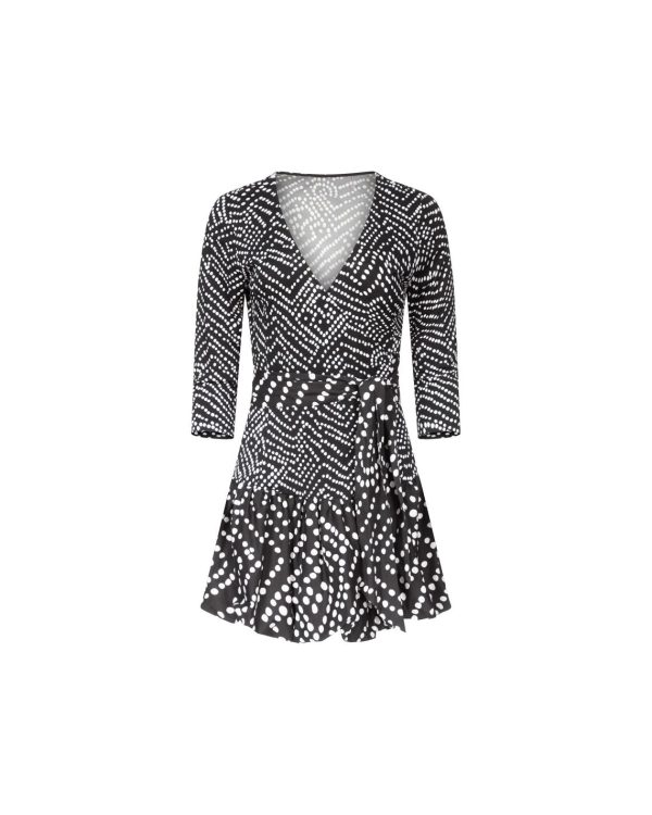 The Heather Wrap Dress combines a matte jersey bodice with a cotton poplin skirt, creating a cinched and structured fit.